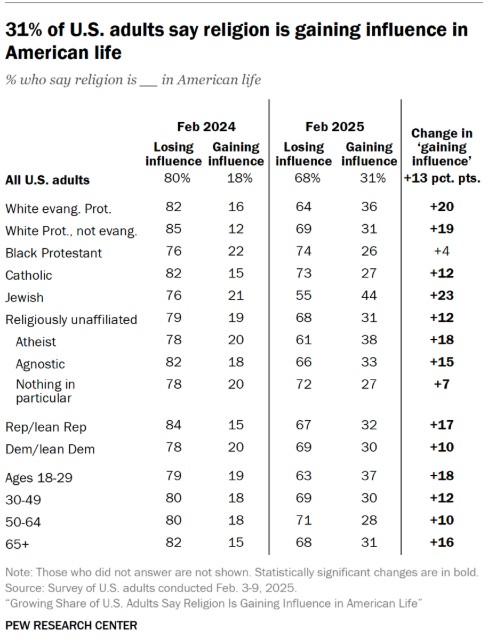 Nearly a third of those surveyed in February, 31 percent, said religion is gaining influence here, up from 18 percent in February 2024 and indicating the highest percentage in 15 years, Pew said.