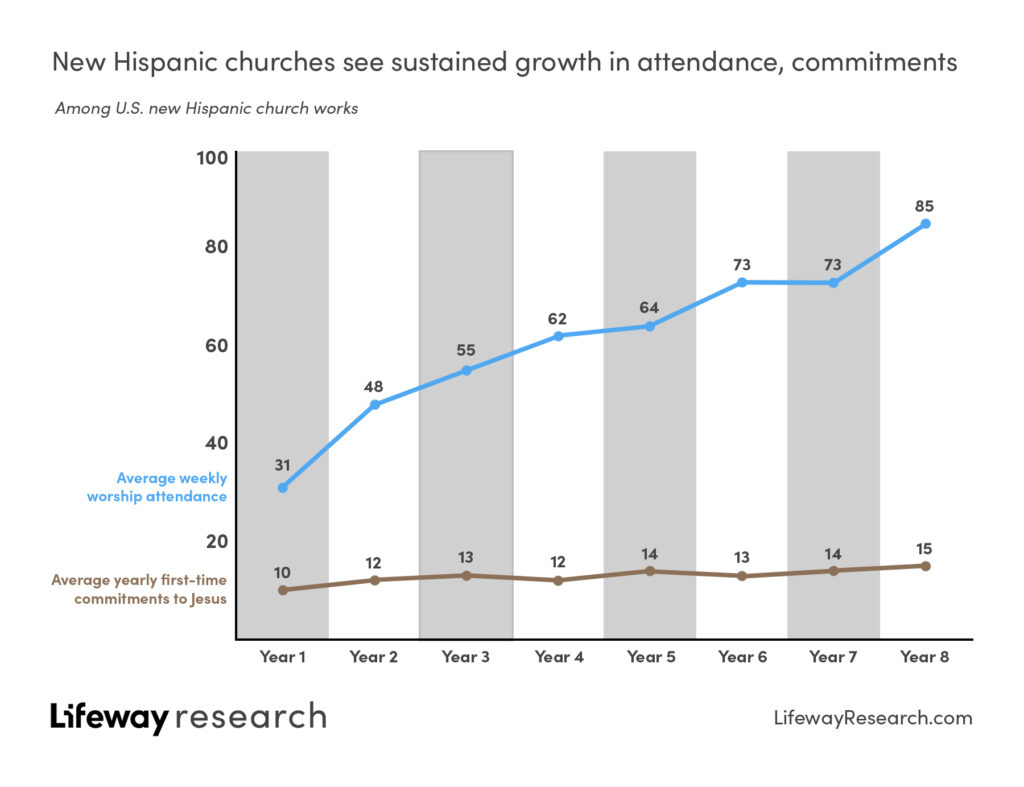 La nueva iglesia hispana promedio comienza con 31 personas asistiendo en el primer año, pero crece de manera constante. Para el octavo año, la iglesia ve un promedio de 85 personas en el servicio de adoración semanal.