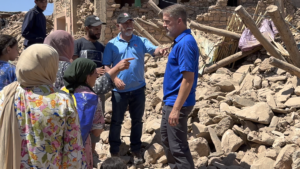 Tras el terremoto del 8 de septiembre en Marruecos, el vicepresidente de ministerio internacional de Send Relief, Jason Cox (derecha), llegó para viajar con los socios de Send Relief en el terreno para repartir suministros y empezar a evaluar la respuesta a la crisis a largo plazo de Send Relief. Foto de Send Relief