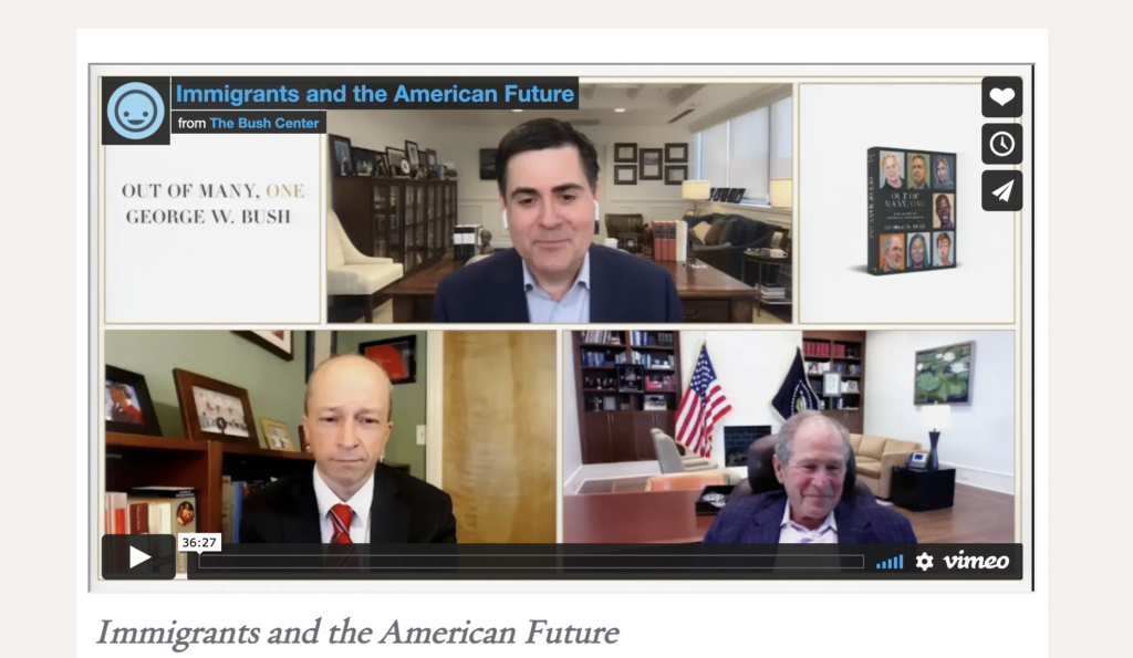 The ERLC joined with the George W. Bush Institute and the National Immigration Forum to present the 35-minute virtual event. ERLC President Russell Moore conducted the discussion with Bush and conservative scholar Yuval Levin. The publication of Bush’s latest book – “Out of Many, One: Portraits of America’s Immigrants” – prompted much of the conversation.