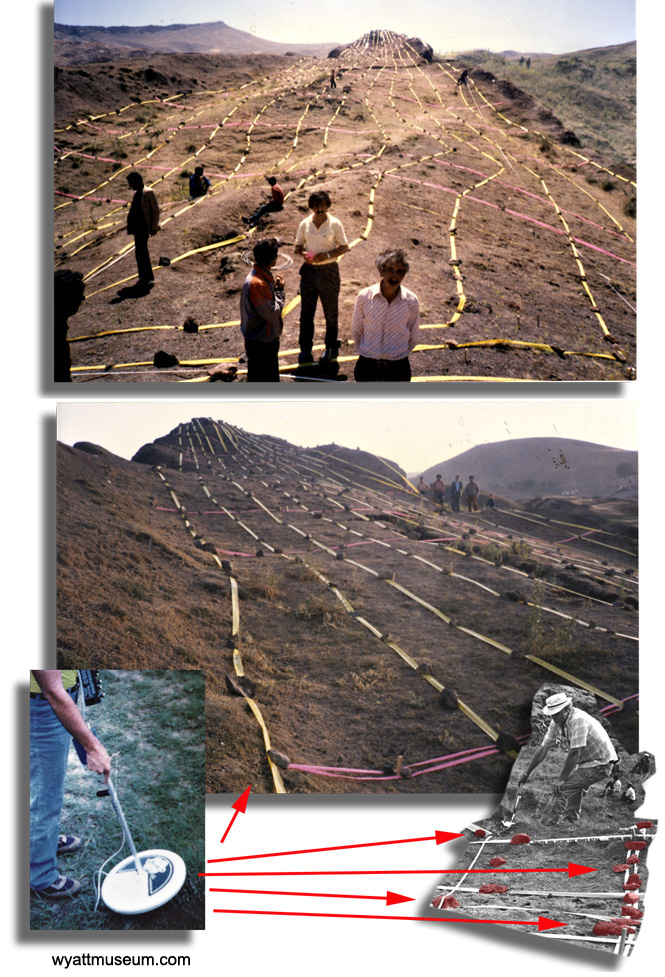 Wyatt and Fasold visited the site in June 1985 to conduct scans with the more advanced metal detectors. Each time they picked up a metal reading, they placed a rock at the spot. Then they connected the rocks with plastic tape. When they stepped back to look at the pattern, they clearly saw a ship-shaped pattern.