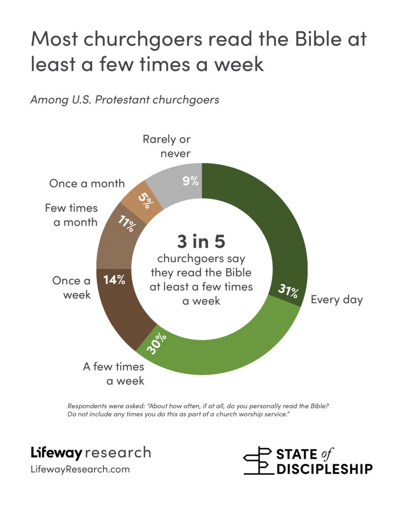 According to the State of Discipleship study, around 3 in 5 Americans who attend religious services at least once a month (61 percent) regularly read the Bible, including 31 percent who read every day and 30 percent who do so a few times a week. Some engage once a week (14 percent) or a few times a month (11 percent). Few say they read Scripture only once a month (5 percent), while 1 in 10 (9 percent) do so rarely or never.