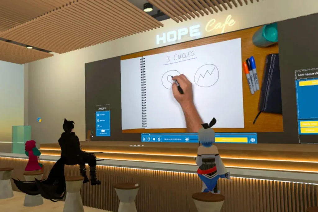 Hope Café, a world within Vket and built by the IMB digital engagement team, is designed as a hub for ministry. Scripture and Gospel materials pop up in Japanese with a single tap on the wall. Every party at the Hope Café features a full Gospel presentation.