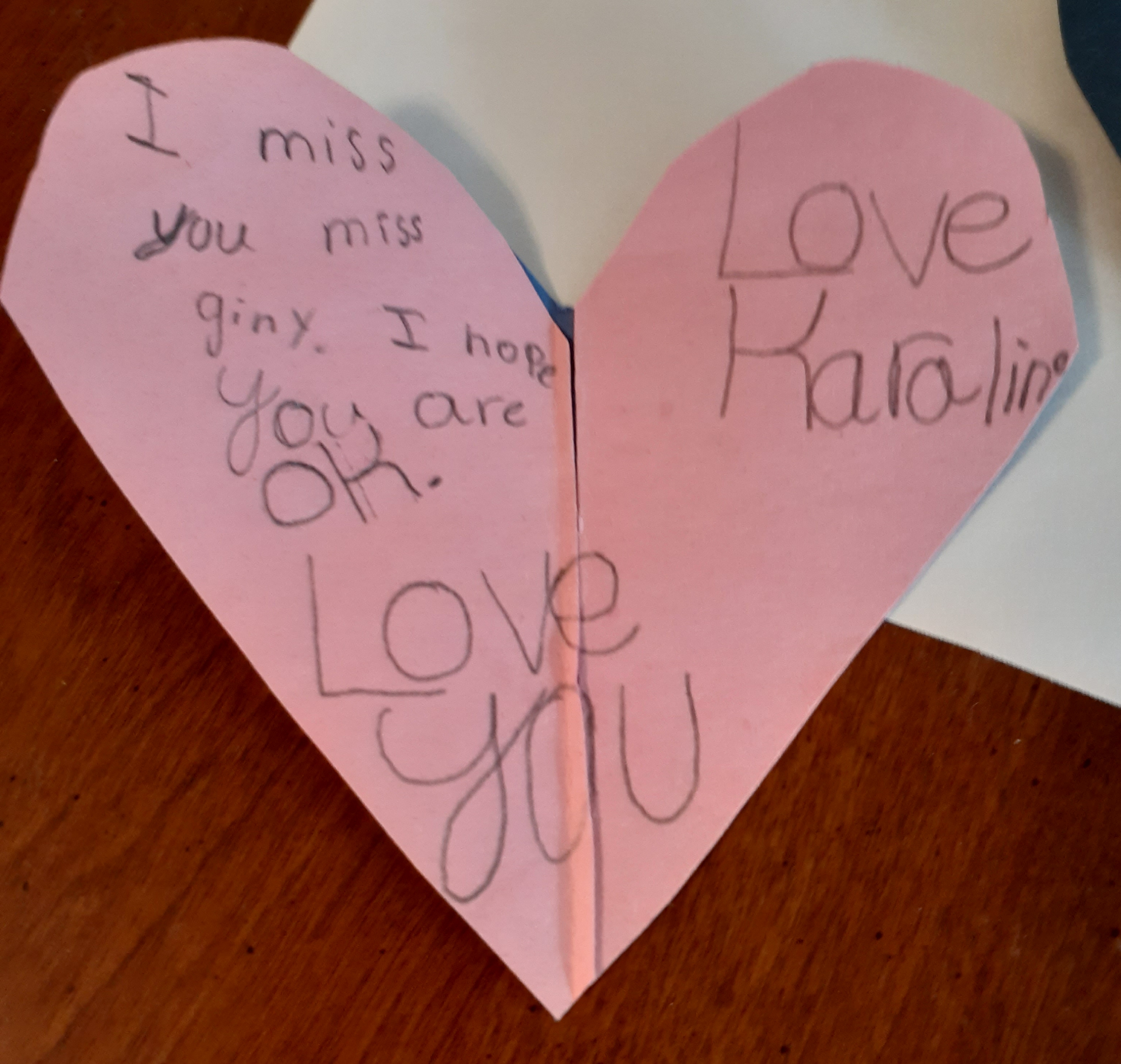The GA parents were receptive to her idea, so she made a poster board sign with a simple but heartfelt message: “I Miss You! Love, Miss Ginny.” Her primary goal was to “tell them that I love them and I miss them and it’s going to be over soon, that we’re going to get through this together.”