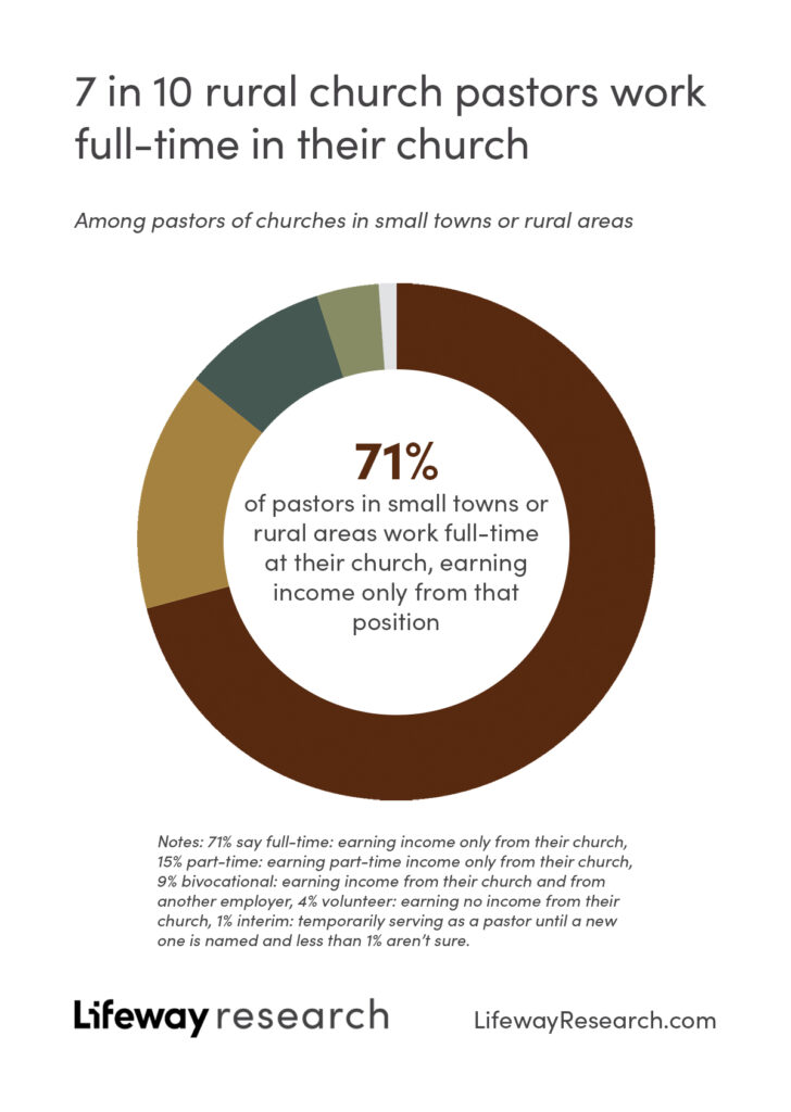 As these churches prepare their budgets, most pay their pastor to serve full-time. Around 7 in 10 (71 percent) small-town pastors say they work full-time and earn their only income from their church.