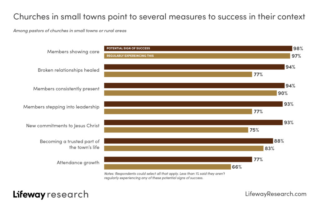 Small-town pastors say success in their context often involves churchgoers making specific applications of their faith. More than 9 in 10 say they consider it a ministry success when they look at their church and see members showing care (98 percent), broken relationships healed (94 percent), members consistently present (94 percent), members stepping into leadership (93 percent) and new commitments to Jesus Christ (93 percent).