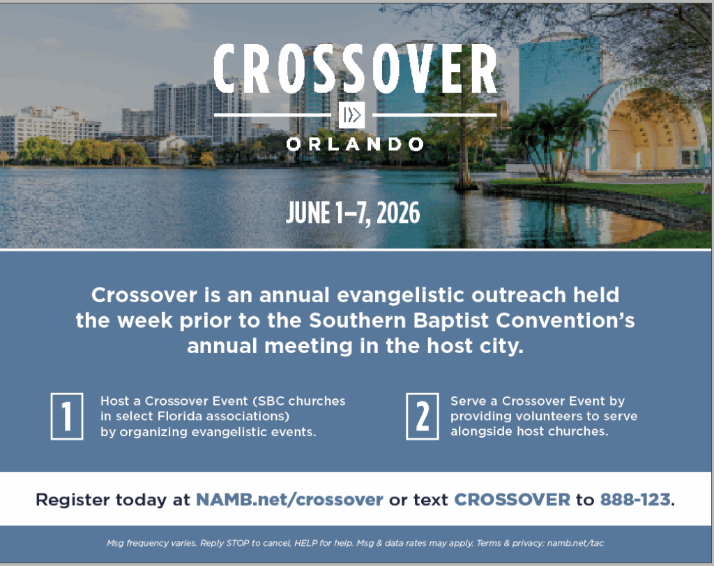 Next year’s Crossover events are coordinated by host churches in the following Florida Baptist associations: Greater Orlando Baptist Association, Ridge Baptist Association, Lake County Baptist Association, Brevard Baptist Association, and East Central Baptist Network.