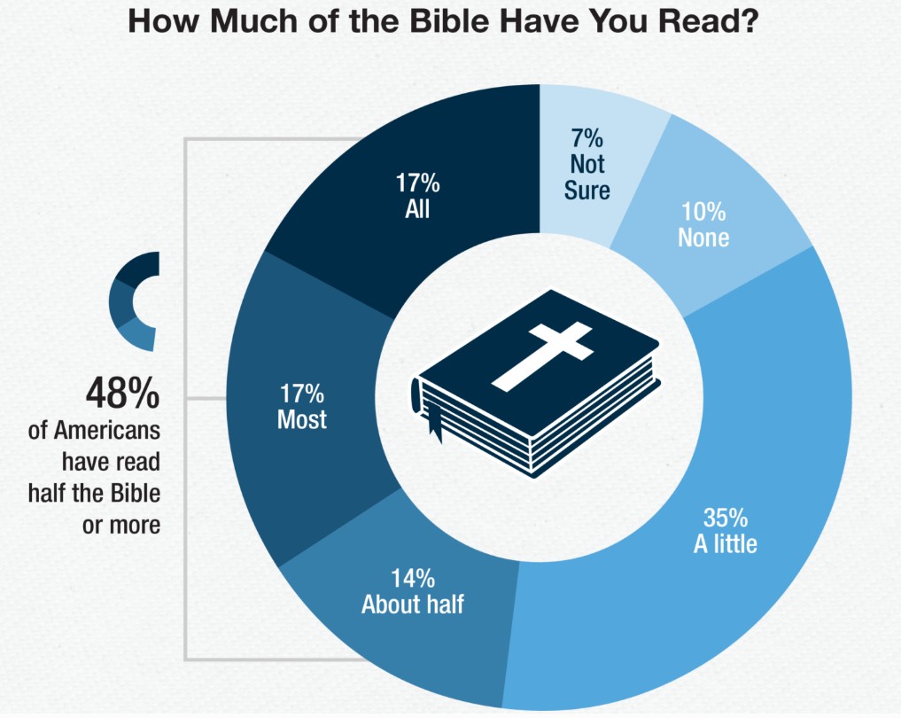 Conversely, 35 percent said they’ve read a little Scripture, 10 percent said they’ve read none, and seven percent said they’re not sure, with a total of 52 percent saying they have read less than half of the Bible.