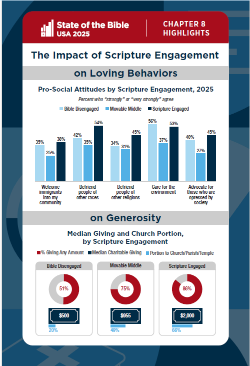 - Nearly 9 in 10 Scripture-engaged individuals, 86 percent, gave to charity in 2024, compared to 51 percent of the Bible-disengaged who gave to charity.