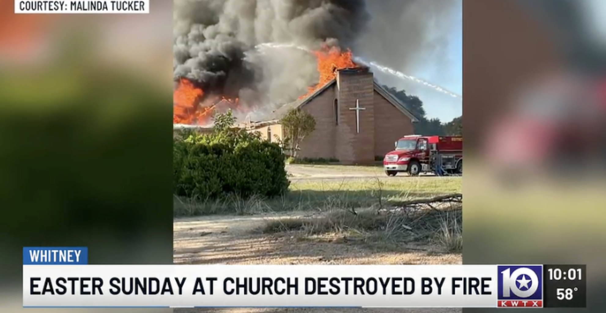 Images shared on social media and local TV showed the church engulfed in flames, with collapsed walls and charred remains of the worship facility.
