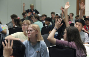 In the final segment, leaders walked around tables and took cards in varying numbers from students. The announcement of how they would lose cards was received with gasps and surprised shouts of “No!” Several pleaded to keep their cards while others bargained to give up their less important cards.