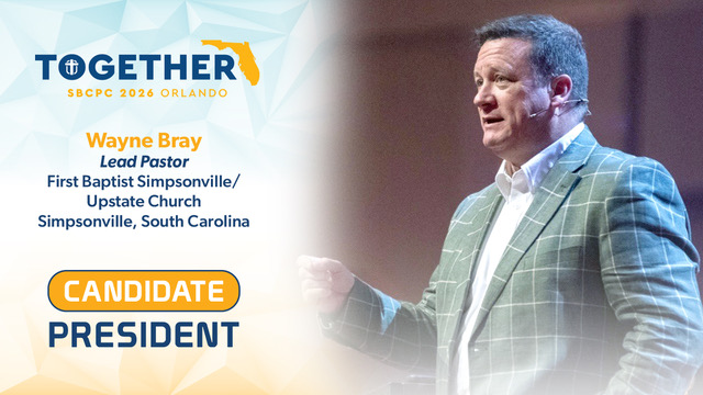 The 2026 SBC Pastors’ Conference will be June 7-8 at the Orange County Convention Center in Orlando. If elected, Bray would serve as president for the following year’s conference.
